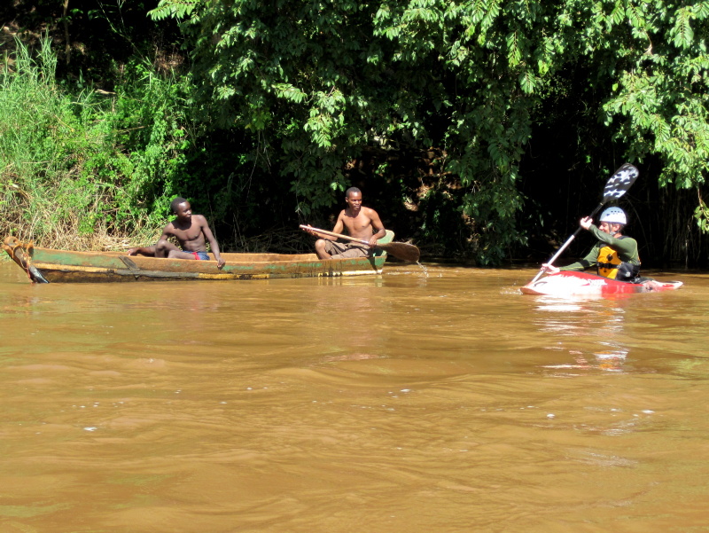 Z devítičlenné skupiny se uvolí jenom šest statečných, kteří otestují neznámou řeku. Odjíždíme sedm kilometrů proti proudu na nasedací místo „Kiosk". Nalézt ho není jednoduché: "u obchůdku se suvenýry odbočíte doleva a potom se několik kilometrů motáte mezi poli". V řece teče kalná voda a vypadá jako o povodních, ale dozvídáme se, že to je spíše nižší stav, období dešťů ještě pořádně nezačalo. Nafukujeme jeden raft Colorado a kanoi Rio, Titus nasedá do kajaku. Domorodci, kteří pracují na okolních polích, se kupodivu neshlukují a neprohlíží si nás jako největší exoty, asi jsou zde na tuto podívanou zvyklí. Nasedáme do lodí a průvodce říká, že po chvíli voleje přijde ostrůvek, který pojedeme zleva, tam je menší peřejka. Tak malá, že ani nemá jméno. Volej je svižně tekoucí voda WW2, u ostrůvku se to kroutí, jsou tam malé skoky a válečky a je to až WW3. Na Riu jsme to propluli jako nic, raft se trošku motal, protože posádka není sehraná. Nutno podotknout, že to bylo poslední zaváhání našich rafťáků.